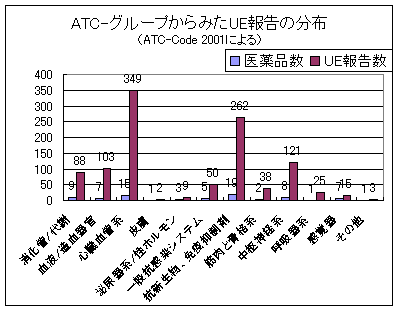 発生し報告された望まない出来事をATC-Code(WHOによる医薬品の解剖学的−治療的−化学的分類)の主グループに分類すると、きわめて多様な分布となる(図2)。しかしこれは、研究のスポンサーによるきわめて多様な情報、また重く発現した多様な患者の基礎疾患、及び治験の医薬品の多様なリスクに由来するものである。治験薬が研究参加者の安全、または研究の実施を損ねるかどうかは、いろいろに評価される。それだけでなく、全ての製造者が、新しい医薬品と関連する世界規模での研究で現われた全てのUEを報告するというわけではなく、薬事法による報告義務だけを満たしている。現在報告されたUEと同じように、以前から現われている類似のUEについての短報やディスカッションを付した詳細な報告がなされることは希である。