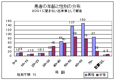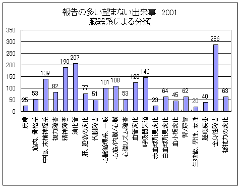 図3は2001年(965の報告にあった2012件)に頻繁に報告された重大または予期しない出来事の分布の一覧である。これにはほとんど全ての臓器システム(WHOのterminologyに相当)に該当し、全身的な障害、消化管の障害及び精神的障害がもっとも多く現われている。希に現われた予期しない出来事(<6)はいろいろあるが、聴覚/平衡感覚障害、内分泌障害及び胎児の変化があった。