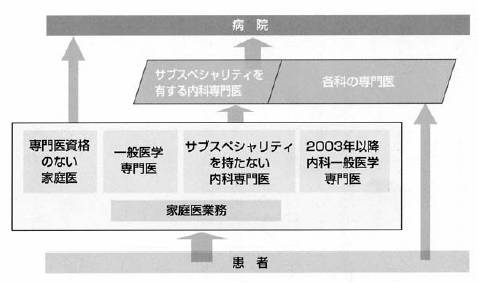 一方、サブスペシャルティを持たない内科専門医と小児科専門医は、1996年に内科または小児科の専門医として留まるか、あるいは一般医学(家庭医)の業務を担当するかの選択を迫られた。95%の小児科医と75%の内科医が一般医学を選択したが、これは一般医学の医師を補強するという意味で、政策的にはプラスであった。その結果、家庭医にはサブスペシャルティを持たない内科または小児科の専門医が加わり、3種類の家庭医が混在することになった(図1)。